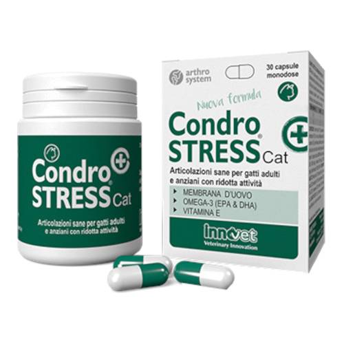 CondroSTRESS CatDescrizione CondroStress+ Cat è indicato per gatti di qualsiasi età affetti da osteoartrite. Nei soggetti anziani, in particolare, preserva la capacità di movimento e migliora di conseguenza la qualità di vita. La membrana d'uovo (Ovopet) costituisce un'esclusiva matrice biologica fonte di collagene, glicosamminoglicani (es. condroitinsolfato, acido ialuronico) e aminoacidi solforati (es. metionina e cisteina). La sua supplementazione dietetica supporta il metabolismo cartilagineo. Gli acidi grassi essenziali omega-3 (EPA e DHA) supportano l'equilibrio sinoviale. La vitamina E svolge una funzione antiossidante, neutrali...